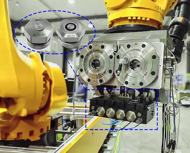 Efek kombinasi: Seluruh proses penggantian dilakukan secara otomatis. Robot atau aktuator hanya perlu "mengikat" modul perkakas ke pencari titik nol, yang secara otomatis menyelesaikan pemosisian yang tepat dan penguncian yang kuat. Pada saat yang sama, konektor bebas kebocoran di kedua sisi juga menyelesaikan penyambungan secara otomatis dan andal, sehingga secara instan menyediakan daya (cairan) dan sinyal kontrol untuk alat tersebut. Saat melepas, urutannya dibalik, pertama lepaskan konektor (tertutup tanpa kebocoran), lalu buka kunci pencari lokasi.