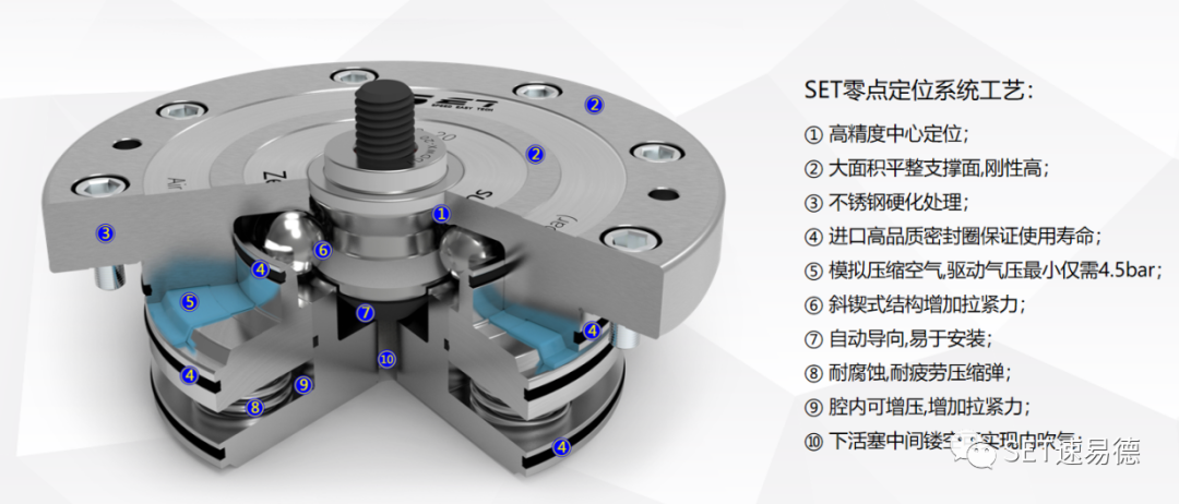 Fitur lain dari sistem titik nol adalah fungsi ganda: penentuan posisi dan penjepit dilakukan secara bersamaan, dengan akurasi kurang dari 5 μs. Pin pemosisian kerucut pendek membuat permukaan kontak sepenuhnya tertutup dan memiliki fungsi penguncian diri. Penjepit penentuan posisi memungkinkan penyimpangan radial dan penyimpangan sudut tertentu, yang memiliki keunggulan tertentu untuk pemuatan dan pembongkaran otomatis atau manual.