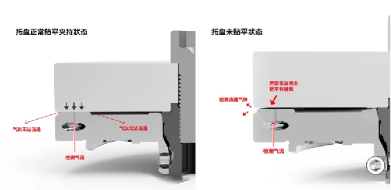 Untuk memastikan stabilitas baki dan memenuhi persyaratan penentuan posisi, posisi nol harus menambahkan perangkat deteksi penjepit, tujuan perangkat ini adalah untuk memastikan bahwa penentuan posisi nol dapat sepenuhnya menghubungi permukaan penentuan posisi baki, dan tidak akan ada potongan besi atau puing -puing lainnya di tengah. Prinsip kerjanya ditunjukkan pada Gambar (1). Udara deteksi akan melepaskan tekanan udara (0,2mpa) di luar lubang. Atur nilai peringkat sensor aliran. Ketika baki tidak datar dengan positioner, seperti yang ditunjukkan pada Gambar 2, gas pelarian yang terdeteksi akan melarikan diri ke luar di sepanjang celah, dan sensor aliran akan menentukan perbedaan aliran, sehingga dapat mewujudkan deteksi penjepit. Lubang deteksi juga akan menyemprot tekanan pembersihan 0,6mpa ke luar untuk memastikan pembersihan stoma. Beberapa locator dapat dideteksi secara bersamaan, sehingga mengurangi biaya; 2. Setelah ada nilai aliran kebocoran di beberapa posisi, itu akan tidak konsisten dengan nilai aliran yang telah ditentukan, sehingga lebih aman; 3. Metode deteksi lebih langsung, baki tidak dimuat, dan klip kosong Positioner dapat dideteksi.